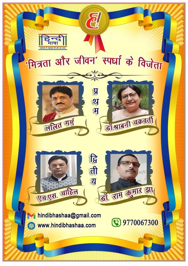 श्रीमती जैन ने बताया कि, १ राष्ट्रीय कीर्तिमान, १.५० करोड़ दर्शकों-पाठकों का अपार स्नेह एवं ७ सम्मान पाने वाले इस मंच द्वारा आयोजित उक्त स्पर्धा में पद्य वर्ग में रचना ‘इनसे दोस्ती आज भी अच्छी’ पर डॉ. श्राबनी चक्रवर्ती (छग) ने प्रथम स्थान प्राप्त किया है, जबकि डॉ. राम कुमार झा ‘निकुंज’ (दिल्ली) की रचना ‘दोस्त नाम विश्वास का’ दूसरे क्रम पर आई है। मंच की संयोजक प्रो.डॉ. सोनाली सिंह, मार्गदर्शक डॉ. एम. एल. गुप्ता ‘आदित्य’, सरंक्षक डॉ. अशोक जी (बिहार) एवं प्रचार प्रमुख श्रीमती ममता तिवारी ‘ममता'(छग) ने सभी विजेताओं व सहभागियों को हार्दिक बधाई दी है।