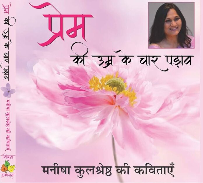 कुछ समय पहले मनीषा की कविताओ की एक किताब “प्रेम की उम्र के चार पड़ाव” शिवना प्रकाशन से आई हैं | प्रेम में गुलाबी होना आपने सुना ही होगा, यहाँ तो किताब भी गुलाबी हैं और उस पर अंकित मनीषा की छवि भी गुलाबी और इन कविताओ को पढ़कर कोई भी पाठक भावों की अनुभूति से सराबोर हो उठेगा.