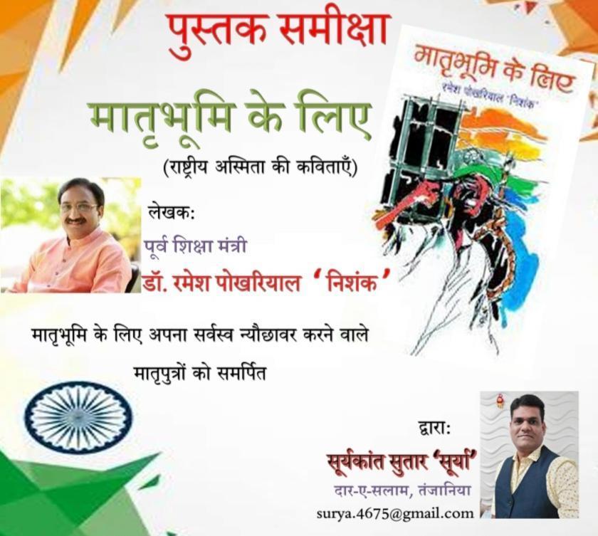 डॉ रमेश पोखरियाल ‘निशंक’ की ‘मातृभूमि के लिए’ कविता संग्रह की कविताएँ निश्चय ही देश में राष्ट्रप्रेम और मातृभूमि के प्रति भावना जागृत करेंगी। इनकी कविताओं का आधार देशप्रेम तथा मातृभूमि की तन-मन-धन से अंतिम सांस तक सेवा करते रहना ही है। अपने देश, राष्ट्र और साहित्यिक समाज को समर्पित यह पहला काव्य नहीं है, ऐसे इनके अनगिनत साहित्य से भरे प्रकाशन हुए हैं, जिसमें डॉ. निशंक की लेखनी कमाल कर रही है। उन्हें अपने स्वयं और मातृभूमि पर इतना विश्वास हैं कि वह कहते हैं-