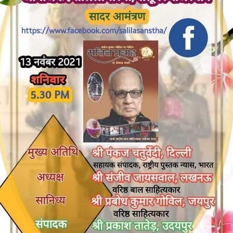 सलिला संस्था, सलूंबर के तत्वावधान में दिनांक 13 नवंबर 2021को सायं सलिल प्रवाह का लोकार्पण वेबीनार की अध्यक्षता सुप्रसिद्ध बाल साहित्यकार संजीव जायसवाल “संजय”, लखनऊ ने की। मुख्य अतिथि नेशनल बुक ट्रस्ट के हिंदी सह-संपादक पंकज चतुर्वेदी थे।