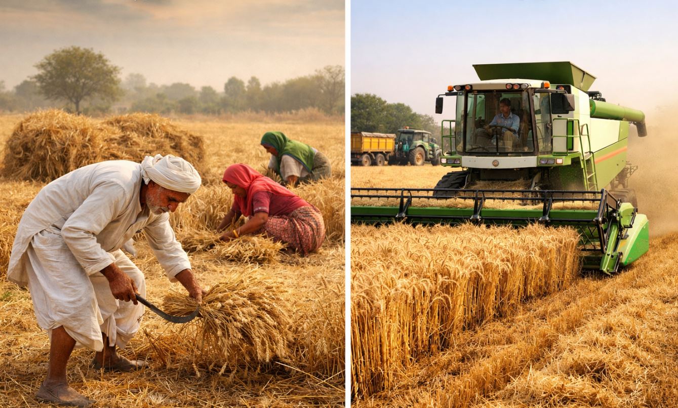 अब तो खैर गांव-गांव तक 5G आ गया है, प्रो मैक्स का जबाना है। ऐसी आधुनिक कंबाइन मशीन आई है जो खेत से ही फसल काट लेती है और गेहूं अलग कर देती है। किसान चाहे तो मशीन से काटने के बाद नीचे बच गई पराली को भूसा बनाने वाली मशीन भी अब आ गई है । अब इस कंबाइन मशीन से एक बीघे गेंहू की कटाई, मँड़ाई, भूसे और गेँहू की छंटाई मात्र 15 मिनट में हो जाती है।